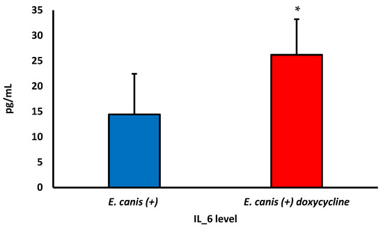 Effect of doxycycline on IL-6 levels of dogs with CME without (blue color) and with (red color) treatment with doxycycline. p < 0.0073; * difference between infected and untreated dogs and dogs treated with doxycycline. Student t-test for two related samples.