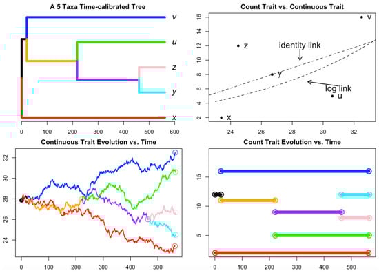 Tree, count trait process, quantitative process, and the bivariate scatter plot. Upper-left panel: a phylogenetic tree of 5 taxa . Upper-right panel: a scatter plot for the count trait data vs. continuous trait data for the 5 taxa. Lower-right panel: a count trait evolution along the phylogenetic tree dependence following a randomized counting process (not necessarily non-decreasing). Lower-left panel: a quantitative trait evolution along the phylogenetic tree with trait values. Each color in the image corresponds to a different branch. The tip values for both the count trait and the continuous are reported in the scatter plot in the upper-right panel. The matrix corresponding to the tree is shown in Equation (5).