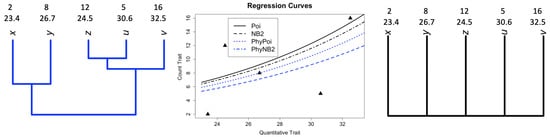 Left panel: phylogenetic tree and two traits. Right panel: star tree and two traits that assume independence. Middle panel: hypothetical regression curves with/without a tree. The regression curves under the GLM approach are reported in black (Poi for Poisson regression and NB2 for negative binomial regression); while the regression curves in blue (PhyPoi for phylogenetic Poisson regression model and PhyNB2 for phylogenetic negative binomial regression model) in blue incorporate the tree ( matrix) under the GEE technique [9] are sketched. The triangles (▲) are the 2D scatter observation for the response trait (count) vs. predictor trait (quantitative).