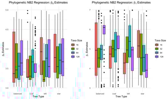 To evaluate the method, we performed a simulation to assess the two regression models in the aspect of parameter estimation. The simulation uses four taxa sizes: n = 16, 32, 64, 128 and 4 types of trees: coalescent tree, balanced tree, left tree, and star tree. One covariate is used for the assessment of the model and the true parameter for is set to . Subsequently, the parameters for simulating responses are computed using the mean function and variance function for the Poisson distribution (as shown in Equation (8)), and the Negative Binomial distribution (as shown in Equation (10)), respectively. The simulation uses 1000 replicates.