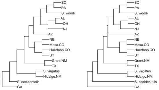 - Leaché, A.D.; Reeder, T.W. Molecular systematics of the eastern fence lizard (Sceloporus undulatus): A comparison of parsimony, likelihood, and Bayesian approaches. Syst. Biol. 2002, 51, 44–68. [Google Scholar] [CrossRef]