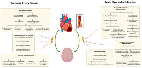 The use of antiplatelet therapy, especially dual antiplatelet therapy for 1 year post-AMI, is also associated with a higher risk of haemorrhagic stroke and cerebral microbleeds, which can also contribute to the development of dementia [,,]. In addition, post-AMI left ventricular failure, cardiogenic shock and atrial fibrillation can lead to decreased cardiac output, hypotension and cerebral hypoperfusion []. In patients with existing hypertension and stenosed arteries, this hypotension potentiates watershed infarctions in vulnerable vascular territories and affects neurovascular reactivity, increasing the risk of cognitive decline [,]. This interdependent relationship between the nervous and cardiovascular systems is known as the “heart-brain axis” [], with patients with heart failure having up to 1.6× more cognitive impairment compared to controls [,].