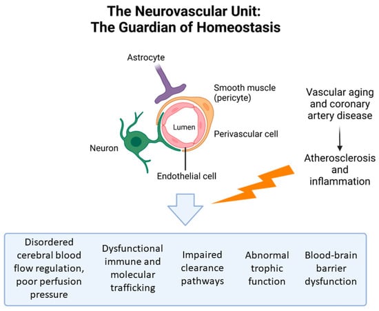 The function of the nervous and cardiovascular systems are intertwined in a complex manner []. Known as the “heart–brain axis”, distant organs work together through neuronal activity, neurohormonal response and vasculature in order to orchestrate a multisystem response and, in some cases, disease process and dysfunction []. Neurological diseases can result in arrhythmias and electrocardiogram changes, and acute central nervous insults such as stroke or haemorrhage can result in myocardial injury []. The sympathetic and parasympathetic systems also affect cardiac function []. At the centre of this is the neurovascular unit, comprising neurons, pericytes, astrocytes, endothelial cells and perivascular cells (Figure 2) [,]. The neurovascular unit regulates cerebral perfusion pressure, blood–brain barrier permeability, immune and molecular trafficking and clearance pathways to maintain normal homeostasis at a cellular level [,,]. Vascular aging can target these sensitive regulatory systems, with atherosclerosis and inflammation resulting in neurovascular unit dysfunction, resulting in disordered homeostasis and subsequent CI and dementia [,,,].