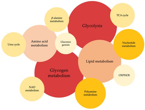 Metabolic pathways reported to be significantly altered in the omics-based studies included in this review. Circle size and color intensity is proportional to the number of studies where the metabolic pathway has been found to be altered.
