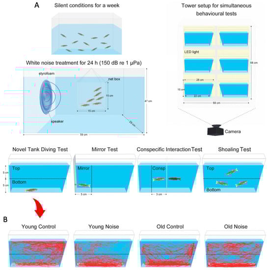 Experimental design showing the acoustic treatment followed by behavioural assays. (A) Young adult (4–7 months) or aged (>24 months) zebrafish were first maintained in silent laboratory conditions for 7 days, then transferred to treatment tanks for 24 h acclimation, and finally exposed to white noise (150 dB re 1 μPA) for 24 h. A tower setup was used to test 6 zebrafish simultaneously for the following tests: novel tank diving (NTD), mirror and/or conspecific interaction, and shoaling. (B) Diagrams showing representative examples of 9 different fish tracking lines (red) based on the period 1–2 min in the NTD test. Blue colour represents water medium in the experimental tanks.