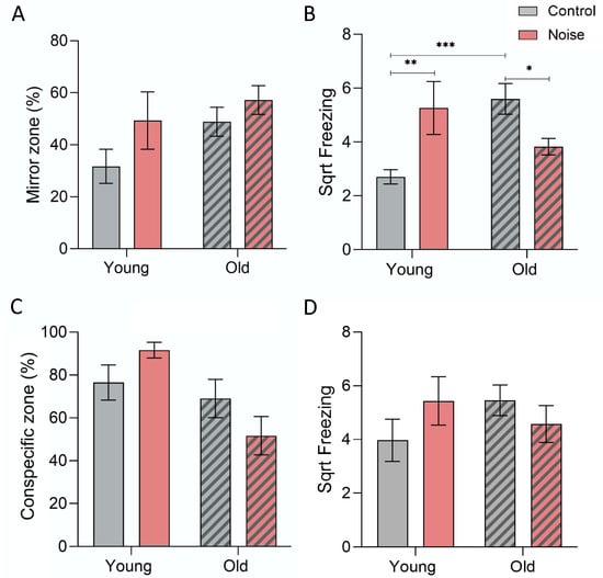 The interaction with the mirror also included freezing behaviour, which was significantly different among the groups (F(3.52) = 5.191, p = 0.003). Ageing alone induced an increase in the freezing time (p = 0.001) as well as the noise exposure (p = 0.010). In the aged individuals, however, the noise treatment caused the opposite trend with reduced freezing (p = 0.016)—Figure 3B. Hence, a significant interaction between age and acoustic treatment was identified for freezing (F(1.45) = 7.129, p = 0.011), contrary to the time spent closer to the mirror (F(1.45) = 0.429, p > 0.05).