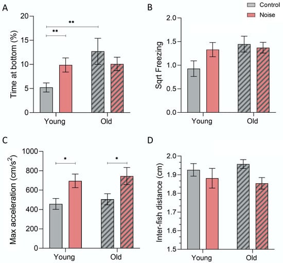 (A) Comparison of the time spent at the bottom of the tank (F(3.65) = 3.207, p = 0.029), (B) freezing (F(3.65) = 2.502, p = 0.068), (C) maximum acceleration (F(3.65) = 4.194, p = 0.009), and (D) interindividual distance (F(3.65) = 2.502, p = 0.068) between zebrafish adults – young and old (striped bars), after acoustic treatment (based on 10 min recording). Post hoc differences: * p < 0.05 and ** p < 0.01.
