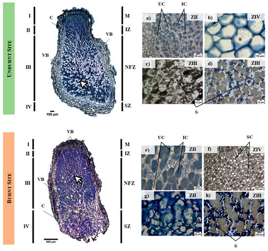Longitudinal semi-thin sections (12 µm) of Acacia longifolia root nodules collected in unburnt and burnt sites. Nodules have four different zones: meristematic zone with a persistent meristem (M) or zone I, infection zone (IZ) or zone II, N-fixing zone (NFZ) or zone III, and senescence zone (SZ) or zone IV. Vascular bundles (VB) are present in the nodule cortex (C). The central infected zone contains infected (IC) and uninfected (UC) cells, and starch granules (S) are present in UC in close vicinity to IC. Senescent cells (SC) were observed in SZ. Reconstructed images on the left were stained with toluidine blue. Magnified images on the right side refer to three different insets: infection zone (identified as ZII), nitrogen-fixing zone (ZIII), and senescent zone (ZIV). Insets (a,b,e) are stained with cotton blue in lactophenol, (c,f) are unstained, (d,h) are stained with Lugol solution, and (g) is stained with Löffler solution. (*) represents rod-shape bacteria inside IC and arrows highlight the quantity of IC. Note that scale bars are different and adjusted to each image.