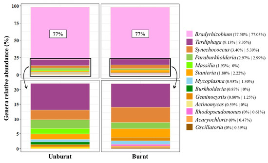 Top 10 genera of the bacteria identified in Acacia longifolia root nodules (cumulative relative abundance, %), for unburnt and burnt sites. The bottom graph represents an inset of the abundance excluding Bradyrhizobium (23%). The percentage was calculated based on the mean value of reads assessed for each site (n = 3) and is presented in the legend considering unburnt followed by burnt values. Colors are assigned according to bacterial classes (gradient of purple, Alphaproteobacteria; gradient of green, Betaproteobacteria; gradient of orange for Cyanophyceae; blue for Mollicutes).