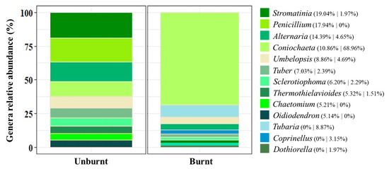 Regarding fungal diversity, in the unburnt site, 91% of genera were found to belong to Ascomycota, with 9% remaining for Mucoromycota. In the burnt site, 83% of the genera found were Ascomycota, with Basidiomycota and Mucoromycota accounting for 12 and 5%, respectively. As shown in Figure 3, in the unburnt site we found Stromatinia (19%), Penicillium (18%), Alternaria (14%), and Coniochaeta (11%) as the main genera, followed by Umbelopsis, Tuber, Sclerotiophoma, Thermothielavioides, Chaetomium, and Oidiodendron, ranging from 9 to 5% of relative abundance. For the burnt site, there was a dominance of Coniochaeta accounting for 69% (also shown in Table 1 with 0.363 ± 0.09 for the Pielou index), followed by Tubaria, Umbelopsis, Alternaria, Coprinellus, Tuber, Sclerotiophoma, Stromatinia, Dothiorella, and Thermothielavioides, sharing almost equally the remaining 31%. Both sites shared 54% of the genera, considering the top 10 rated taxa.