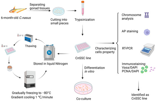 The flow chart of experiments. A total of five 6-month-old C. nasus measuring 12 cm in length were accessed. Live fish were put on ice and did not respond to mechanical stimulation. All gonadal tissues were separated, then twice washed in PBS with 1% antibiotics. They were minced and dissociated by trypsinization. The cells were transferred to liquid nitrogen for cryopreservation through appropriate culture. The cells were verified through chromosomal analysis, alkaline phosphatase (AP) staining, RT-PCR, and immunofluorescence and characterized through induction in vitro (the figure was created by Biorcndcr.com).