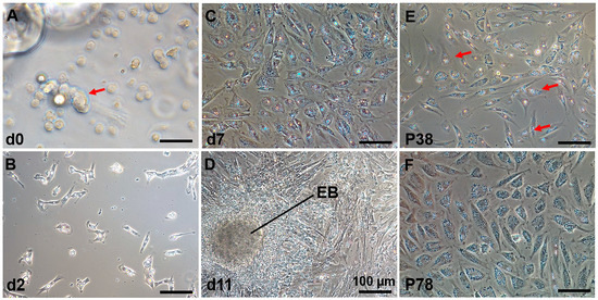 C. nasus spermatogonial stem cells (CnSSCs) were cultured in vitro. (A) The cells were initially dissociated from the gonadal tissue with a large amount of fat (arrow); (B) a small number of C. nasus primary testis cells adhered to the plate on the second day; (C) the cells adhered to the plates, proliferated, and achieved 80% confluency within seven days; (D) primary culture of testis cells on the 11th day. EB: embryoid bodies. (E) Cell morphology on the first day of picking spheroid colonies in culture showing a small size and oval or polygonal shape after dissociation (arrow); (F) subculture of CnSSC cells at passage 78. (Bars = 20 µm unless indicated.)