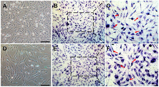 Alkaline phosphatase staining of CnSSCs. (A–C) Morphology and positive alkaline phosphatase activity staining of cells at P38 (arrow). (D–F) morphology and positive alkaline phosphatase staining of P38 cells after thawing (arrow). The squares of (B(E)) are showed in (C(F)). (Bars = 20 µm.)