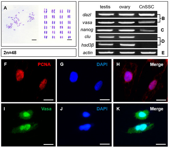 Chromosome analysis, RT-PCR analysis, and immunofluorescence analysis of CnSSCs. (A) Diploid metaphase of CnSSCs. (B) Expression of germ cell markers, using RT-PCR, of total RNA from CnSSCs and adult tissues with primers for dazl and vasa. (C) Expression of a stem cell marker, using RT-PCR, with primers for nanog. (D) Expression of somatic cell markers, using RT-PCR, with primers for clu and hsd3β. (E) Expression of actin was determined for calibration. (F–K) Immunofluorescence of PCNA (red) and Vasa (green) in CnSSCs. (Bars = 10 µm.)