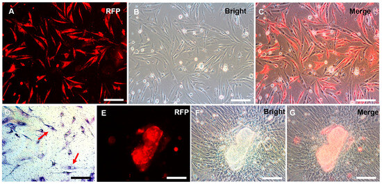 The red fluorescent protein (RFP)-expressing CnSSCs were cultured in vitro. (A–D) After stable proliferation, CnSSCs cells labeled with RFP were extracted using methods of single-cell clone culturing, exhibiting positive alkaline phosphatase staining (arrow). (E–G) RFP-expressing CnSSCs formed embryoid bodies by coculture with CnGSCs. (Bars = 20 µm.)