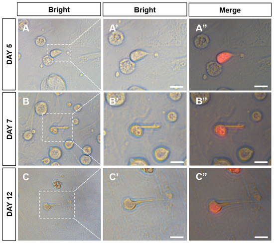 Spermiogenic progression and sperm production from CnSSCs induced in vitro. (A–C) CnSSC cells differentiated into spherical sperm for 5 days (A); the tail pulled longer on the 7th and 12th days (B,C). (A’’–C’’) Merge of bright and fluorescent fields. (Bars = 5 µm.)