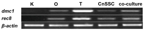 To ascertain whether CnSSC cells proceed through meiosis, we evaluated the meiotic gene transcripts present in CnSSC cells through RT-PCR. Under normal culture conditions, the levels of mRNA for both genes were low in CnSSC cells (Figure 7). Notably, increased expression levels of both genes were found in CnSSC cells through coculture (Figure 7).