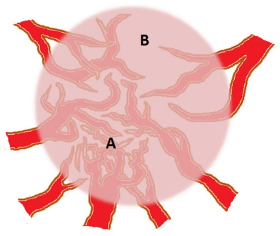 The circular and pink shadow indicates a tumor mass. Tumor blood vessels can be heterogeneous in terms of density, with areas of higher density (A) and lower density (B) within the same tumor mass. This can significantly influence tumor growth and response to treatments. The effectiveness of chemotherapy is diminished in region (B), where the transportation and cellular absorption of drugs by tumor cells are inferior compared to region (A). Additionally, within (B), regions are dominated by quiescent tumor cells that are less responsive to the effects of chemotherapeutic agents. These cells exhibit a reduced sensitivity and demand lower levels of oxygen and nutrients to sustain their survival.