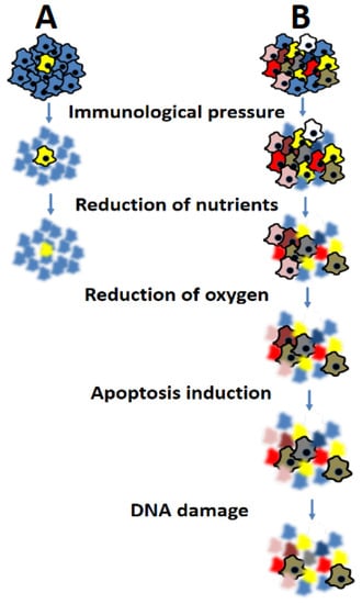 A tumor mass with a genetically more homogeneous cellular population (A) is evolutionarily disadvantaged compared to a more heterogeneous one (B). The cellular mass in (B) can withstand and overcome all obstacles that limit its growth.