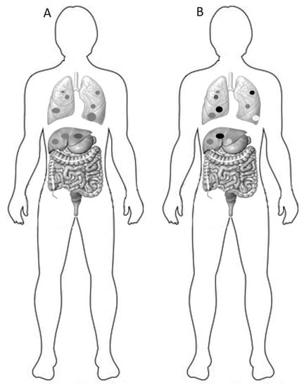 Metabolic heterogeneity is visualized using lesions with varying shades of gray, where darker shades indicate higher glucose uptake. It is assessed using positron emission tomography (PET) imaging with the glucose analog tracer 18F-fluorodeoxyglucose (FDG) and reveals differences in the metabolic behavior of cancer cells within different patients patient (B) exhibits more pronounced heterogeneity in metastatic lesions compared to (A). This heterogeneity suggests the presence of distinct metabolic characteristics in certain regions or subpopulations of cancer cells, which can impact tumor growth, aggressiveness, and treatment response. Genetic alterations, microenvironmental conditions, and cellular adaptations are among the factors that contribute to the development of metabolic heterogeneity.