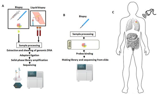 In (A), the main methodological steps that enable next-generation sequencing (NGS) from solid or liquid tumor biopsies are exemplified. In (B), utilizing nanostring technology reduces the number of steps as the assessments are performed directly on the tissue. In the future, it is conceivable that biopsies may not be required, and biological macromolecules will be read directly from the patient (C).
