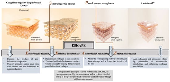 Numerous studies have reported that the most common pathogens associated with wound infections are Staphylococcus aureus (S. aureus); Pseudomonas aeruginosa (P. aeruginosa); Escherichia coli (E. coli); coagulase-negative Staphylococci (CoNS), i.e., Staphylococcus epidermidis (S. epidermidis); Streptococcus pyogenes (S. pyogenes); Klebsiella spp.; and Proteus spp. [28,29,30,31,32]. In chronic wounds, S. aureus, followed by P. aeruginosa, is the most common isolated microorganism [2,33,34], inhibiting wound healing, and is considered dominant [35,36]. However, many other commensal species have been isolated from cutaneous wounds, such as lactobacilli, which might have a positive therapeutic effect. Herein, we focus on the effect of CoNS, S. aureus, P. aeruginosa, and Lactobacilli on the wound-healing process, as illustrated in Figure 1.