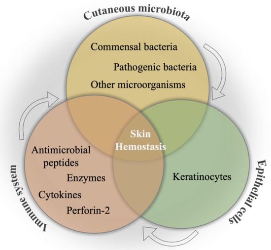Schematical illustration of the relation between cutaneous microbiota, immune system, and epithelial cells for skin hemostasis.