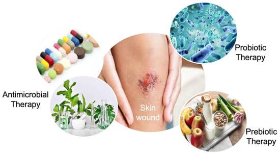 Most skin conditions such as wound infections are related to the instability in skin microbiota [114]. Microorganisms in wounded skin microbiota may delay or block the natural healing process as well as inflammation, even if the bacterial infection has not initiated wounding. Therefore, the dynamic skin microbiota presents an adequate platform for wound-healing treatment [116,117]. The manipulation of the skin microbiota has been studied by antimicrobial and prebiotic/probiotic therapies to accelerate the healing of the wound (Figure 3).