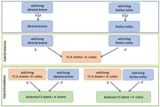 - Šimková, A.; Civáňová, K.; Vetešník, L. Heterosis versus breakdown in fish hybrids revealed by one-parental species-associated viral infection. Aquaculture 2022, 546, 737406. [Google Scholar] [CrossRef]