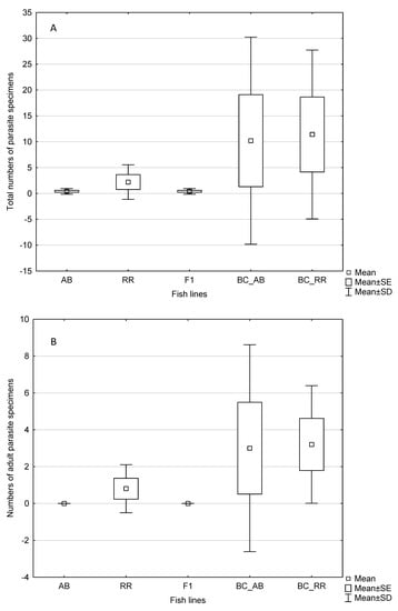 - Krasnovyd, V.; Vetešník, L.; Šimková, A. Distribution of host-specific parasites in hybrids of phylogenetically related fish: The effects of genotype frequency and maternal ancestry? Parasites Vectors 2020, 13, 402. [Google Scholar] [CrossRef] [PubMed]