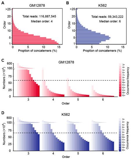 The recently released GM12878 and K562 HiPore-C data were used to construct the hyperedges. As described in the previous study, they greatly increased the output of multi-way contact sequencing by solving nanopore clogging, which limited the throughput of the traditional Pore-C method [21]. Taking the data quality into account, we adopted the HiPore-C data and achieved ~116M and 67M valid multi-contact reads for GM12878 and K562, respectively (Figure 1A,B). The multiple fragments covered by a read were regarded as the vertices under a 1 Mb resolution, which further connected each read into a hyperedge. To improve the data accessibility, we decomposed the higher-order contacts into several lower-order hyperedges (order ≥ 3). The number of generated hyperedges is listed in Table S1. We selected different occurrence frequency thresholds to maintain the sample size balance among the hyperedges that had various orders (Figure 1C,D). Specifically, for GM12878, we set the frequency threshold to 12 with the order of three, four with the order of four, three with the order of five and three with the order of six, resulting in 615,731, 604,243, 680,788 and 412,131 hyperedges corresponding to the orders of three, four, five and six, respectively. For K562, we set frequency threshold to 14 with the order of three, nine with the order of four, nine with the order of five and nine with the order of six, which resulted in 681,028, 665,728, 662,930 and 645,731 hyperedges corresponding to the orders of three, four, five and six, respectively.