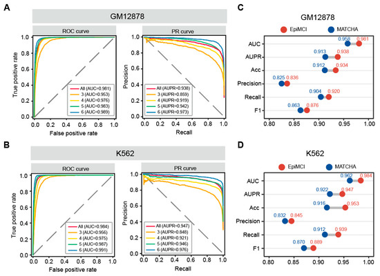 Compared to MATCHA, the EpiMCI showed a better performance with an average AUC score of 0.981 and an AUPR score of 0.938 using the GM12878 data (Figure 3A). For the K562 data, the AUC score was 0.984 and the AUPR score was 0.947 (Figure 3B). The EpiMCI was able to make accurate predictions across the hyperedges with different orders in both GM12878 and K562 (Figure 3C,D). It is worth noting that the classification performance increased with the number of hyperedge orders. In this study, the hyperedges mainly consisted of two parts. One was the fragment numbers observed by the original sequencing data and the other was the sources from the decomposition of the hyperedges with higher orders. The hyperedge construction could have accounted for the result above since we kept the hyperedge numbers consistent among the different orders, which resulted in redundant vertices among the hyperedges within small orders, such as three and four. The redundant information did not predict the performance as well as the hyperedges with large order and non-redundant vertices. Overall, this evaluation suggested that the EpiMCI was able to accurately predict a fraction of the hyperedges derived from multi-way chromatin interaction data along with their epigenetic information.