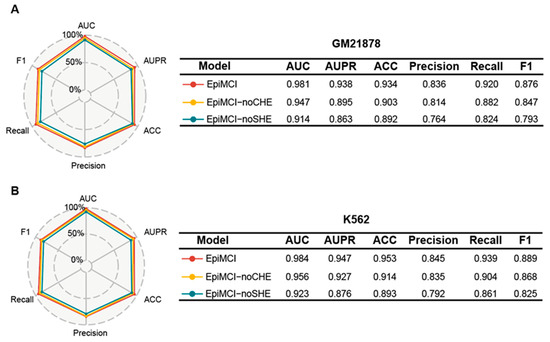 Experiment results of the ablation analysis. (A) Ablation results for GM12878. (B) Ablation results for K562. The EpiMCI-noCHE means that we removed the coupling hyperedges representation of the EpiMCI, and the EpiMCI-noSHE means that the separating hyperedges representation was omitted.
