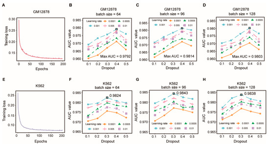 In this section, we first explored the model convergence by observing the change in the training loss with the epochs during the training process. As shown in Figure 5A, the loss training in the GM12878 datasets converged at the 200th epoch, which implied a reasonability and acceptability of the model. It was the same when training on the K562 datasets (Figure 5E). In addition, the deep learning models could perform differently with the different hyperparameter values. To illuminate how the hyperparameters impact the predictive performance of the proposed model, we applied a grid search and a five-fold CV on the GM12878 HiPore-C dataset to obtain the optimal values of the following hyperparameters: the batch size (s), dropout (d) and learning rate (lr). The s was selected from {64, 96, 128}, d was selected from {0.1, 0.2, 0.3, 0.4, 0.5} and lr was selected from {0.0001, 0.0005, 0.001, 0.005, 0.01}.