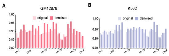To further access the performance of the EpiMCI, we applied it to denoise the whole-genome chromatin interaction, as the noise introduced by experiments, such as randomly ligated DNA, was inevitable for the technique [52,53]. Here, we obtained all the pairs of 1 Mb genomic bins and used them as the input for the trained model. The resulting probabilities of pairwise interactions was reshaped as an N × N matrix and denoted as a likelihood matrix. Then, the denoised contact matrix was calculated using the element-wise product of the likelihood matrix and the original contact matrix, which was defined as the HiPore-C contact matrix decomposed from a chromatin multi-way interaction. We compared the denoised contact matrix to the original contact matrix and Hi-C contact matrix using the GenomeDISCO score, a concordance measurement proposed to assess the similarity of a pair of contact maps obtained from chromosome conformation capture experiments [39]. The denoised map improved as a whole in both GM12878 and K562, although there were several exceptions such as in chr1, chr16 and chr17 (Figure 6A,B). Note that chromosome 9 in the K562 data was excluded due to its high sparsity, which was also mentioned in a previous study [54]. Overall, the results showed that the EpiMCI could be applied to improve the HiPore-C data and has potential to be generalized to other types of data for capturing chromatin multi-way interaction, such as the SPRITE, ChIA-Drop and Pore-C datasets.