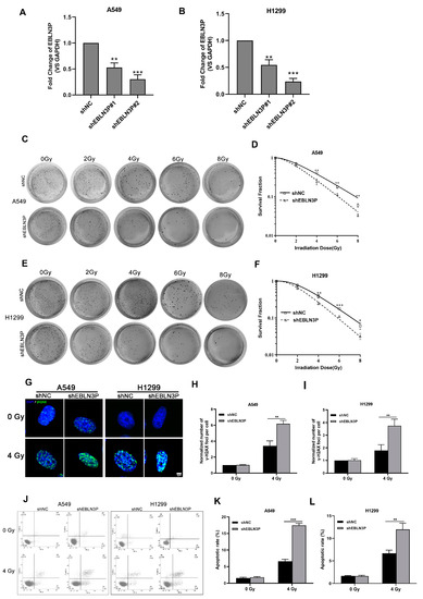 Our previous studies have reported that the high expression of LNC EBLN3P in NSCLC cells contributes to the regulation of radiosensitivity. To further clarify the role of LNC EBLN3P in conferring radioresistance to NSCLC cells, we employed lentiviral vectors expressing short hairpin RNAs (shRNAs) to knockdown its expression in A549 and H1299 cells. The interference efficiency of two shRNAs was assessed at 48 h post-transfection. As depicted in Figure 1A,B, shEBLN3P#2 exhibited the most optimal knockdown efficacy and was therefore selected for further investigation. Moreover, the impact of LNC EBLN3P knockdown on the colony-forming ability was evaluated in A549 and H1299 cells subjected to varying doses of irradiation. A significant reduction in the number of colonies formed by A549 and H1299 cells transfected with LNC EBLN3P-shRNA was observed compared to control cells (Figure 1C–F). The phosphorylated form of γH2AX has been validated as a sensitive biomarker for DNA double-strand breaks (DSBs). To evaluate the impact of LNC EBLN3P inhibition on radiation-induced DNA DSBs, the number of γ-H2AX foci was quantified using immunofluorescence microscopy (Figure 1G–I). Moreover, the incidence of radiation-induced apoptosis was significantly elevated in A549 and H1299 cells following LNC EBLN3P knockdown (Figure 1J–L). The collective findings demonstrate that the downregulation of LNC EBLN3P significantly enhances the radiosensitivity of NSCLC cells.