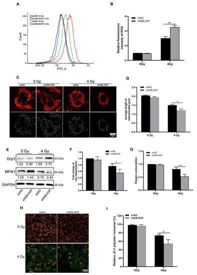 The radiation-induced generation of ROS can lead to intracellular oxidative stress, resulting in irreversible cellular damage. Therefore, intracellular ROS levels were monitored in H1299 cells at 1 h after exposure to 4 Gy of X-ray irradiation. The downregulation of LNC EBLN3P was found to effectively decrease radiation-induced ROS generation in H1299 cells, as demonstrated by Figure 2A,B. Numerous studies have demonstrated that excessive intracellular production of ROS induced by radiation is associated with enhanced mitochondrial damage, ultimately resulting in lethal cellular injury and death. To investigate the role of LNC EBLN3P in radiation-induced mitochondrial damage, we assessed mitochondrial length and membrane potential in H1299 cells with LNC EBLN3P knockdown following exposure to 4 Gy X-ray irradiation. Mitochondrial fluorescence staining suggested that H1299 + shEBLN3P cells displayed more severe mitochondrial fragmentation, characterized by small, round fragments, than H1299 + shNC cells (Figure 2C). Consistently, the measurement of mitochondrial length showed a significant decrease in average mitochondrial length in H1299 + shEBLN3P cells (Figure 2D). Mitochondrial dynamics are regulated by fission and fusion processes, which are mediated by specific proteins such as dynamin-related protein (Drp1), mitofusin1, and mitofusin2 (Mfn1/2). After exposure to 4 Gy X-rays, cells with LNC EBLN3P knockdown showed a higher expression of the fission gene Drp1 and a lower expression of the fusion gene MFN1 compared to the control cells (Figure 2E and Figure S4).