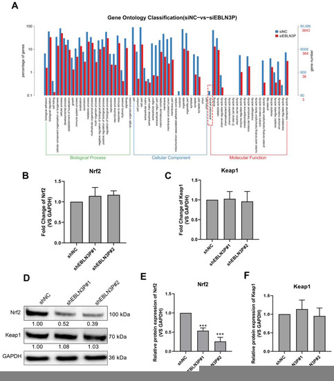 LNC EBLN3P targets the Keap1-Nrf2 system. (A) GO pathway enrichment analysis. The dashed box highlights the antioxidant activity inhibited by LNC EBLN3P knockdown. (B,C) qPCR analyses of the transcription expression of Nrf2 and Keap1 in H1299 cells transfected with shNC or shEBLN3P. Relative densitometry values for the representative blots are given below each band. (D–F) Western blot analyses of Nrf2 and Keap1. Data are represented as means ± SD (three biological replicates; *** p < 0.001).