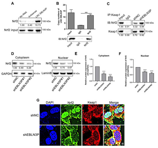 LNC EBLN3P interacts with Nrf2 to inhibit the association between Keap1 and Nrf2. (A) RNA pull down analysis was used to determine the Nrf2-LNC EBLN3P interaction in H1299 cells. (B) Histogram of LNC EBLN3P enrichment after RNA immunoprecipitation (IP) assays. Nrf2 antibodies were used (three biological replicates; *** p < 0.001). (C) Immunoprecipitation followed by Western blot was used to detect the interaction of Nrf2 with Keap1. All experiments were independently repeated at least three times. (D–F) The expression of Nrf2 was assessed using Western blot analysis in both the nucleus and cytoplasm. Relative densitometry values for the representative blots are given below each band. Data are represented as means ± SD (three biological replicates; ** p < 0.01, *** p < 0.001). (G) The co-localization of Nrf2 (green) and Keap1 (red) in cells was detected through an immunofluorescence assay. Nuclei were stained with DAPI (blue). Scale bar = 5 μm.