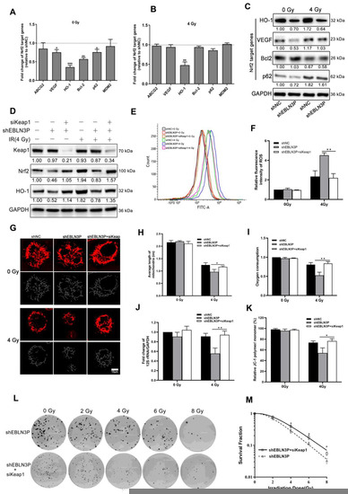 Therefore, the overexpression of LNC EBLN3P in NSCLC cells is thought to impede the interaction between Nrf2 and Keap1, leading to the stabilization of Nrf2 and subsequent transcriptional activation of its target genes. High Nrf2 activity in cancer cells leads to the upregulation of various proteins associated with cancer progression, including ABCG2, VEGF, HO-1, Bcl-2, p62, and MDM2. Similarly, we observed that the knockdown of LNC EBLN3P led to changes in the expression of Nrf2 target genes. Specifically, there was a significant decrease in the transcriptional expression levels of VEGF, Bcl-2, HO-1, and p62. However, only HO-1 continued to decrease after irradiation (Figure 5A–C and Figure S4). After knocking down LNC EBLN3P in H1299 cells, the binding between Keap1 and Nrf2 was increased, and this promoted Nrf2 degradation and subsequently affected the expression of HO-1. Therefore, we proceeded to knockdown Keap1 in H1299 + shEBLN3P cells as a means of confirming the impact of LNC EBLN3P on Nrf2 function via Keap1. As shown in Figure 5D and Figure S4, the knockdown of Keap1 prevented the reduction in Nrf2 and HO-1 levels induced by the downregulation of LNC EBLN3P in H1299 + shEBLN3P cells, whether treated with radiation or not. Similarly, Keap1 silencing alleviated the increase in ROS production (Figure 5E,F), mitochondrial damage (Figure 5G–K) and the enhancement in radiosensitivity (Figure 5L,M) induced by the downregulation of LNC EBLN3P in irradiated H1299 + shEBLN3P cells.