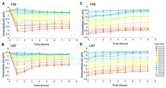 Figure 1A,B show the effect of pH change on the pH of F98 and U87 cells as a function of time. In the short term (∼1 h), the sudden change in pH creates a shock for the cells, since the pH of both cell lines almost instantly takes the value of the pH. Then, the pH regulation process takes 2 h to produce an effect and one more hour to reach a stationary state. In the longer term, after 4 h and for up to 8 h, the pH remains stable and is specific to the cell line.
