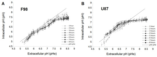 For F98 cells, the pH is almost always lower than the pH, especially as time increases (Figure 2A). For this cell line, there is no inversion of the pH gradient as usually documented in tumor cells [46]. In addition, a quasilinear increase in pH with pH in the range of [5.0–7.2] is observed, and the values of pH are very close to those of pH. Moreover, the dependence of pH as a function of time is low in the acidic pH range, as the curves are almost superimposed. However, the range with higher pH values shows a marked dependence of the pH over time. In the first 4 h, the pH of F98 cells decreases sharply and stabilizes after 5 h. At that time, the relationship between pH and pH exhibits a plateau for pH values above 7.2. Therefore, F98 cells have the ability to progressively adjust their pH over time under basic conditions (above 7.2).