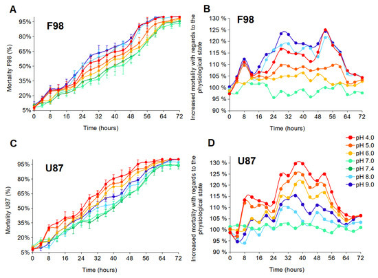 Effects of pH on cell mortality of F98 and U87 cells. (A,B) The evolution of the percentage of dead cells (relative to the entire number of cells in the population) over time. Each measured point represents the mean (±SD) of three independent experiments. (C,D) The excess mortality compared to the control set at 100% (which is standard culture medium with an initial physiological pH of 7.4).