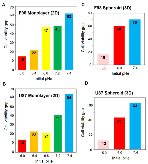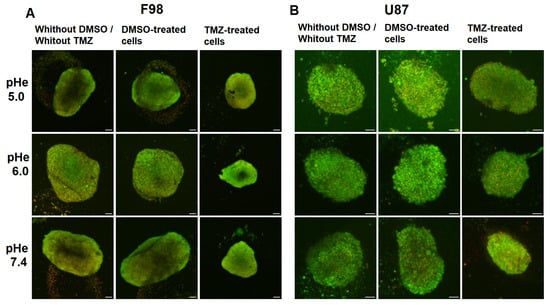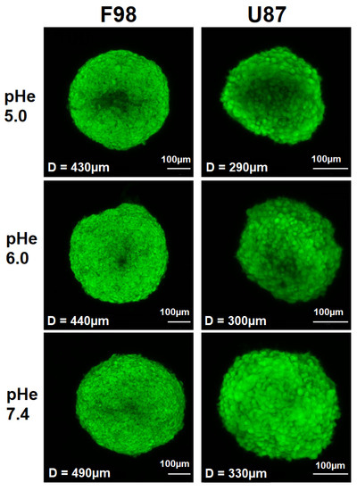 Under identical culture conditions, F98 spheroids (diameter of 430–490 m) are larger than U87 spheroids (diameter of 290–330 m) (Figure 4). It has been reported that the size of spheroids, ranging from tens to hundreds of microns in diameter, is critical for cellular functions and model applications; thus, spheroids of different sizes do not exhibit the same properties [65]. For example, spheroids with a diameter < 150 m do not develop chemical gradients (pH, oxygen concentration, etc.). These gradients are usually generated in spheroids with diameters > 200 m and increase with increasing spheroid size [65,66]. Therefore, due to a size-induced oxygen difference, larger pH gradients are expected in F98 spheroids than in U87 spheroids. Moreover, F98 spheroids are much more spherical than U87 spheroids with a denser and more compact shape. Therefore, the nature of cell–cell interactions probably differs between the two cell lines.