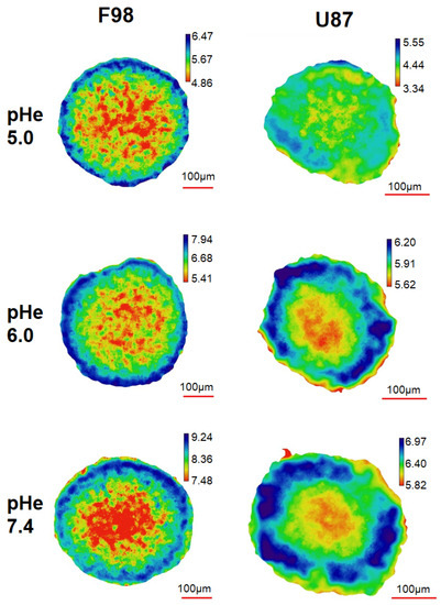 pH maps for a slice located at a depth of 85 m for F98 (left) and U87 (right) spheroids. The spheroids were exposed to three different pH conditions for 8 h. Scale bar = 100 m.