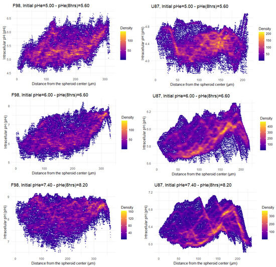 The distribution of the pH measured for each pixel as a function of the pixel distance from the center of the spheroid is represented in Figure 6 for the two cell lines exposed to three different initial pH values (5.00, 6.00 and 7.40). Each point on the pH distribution represents a pixel of the map, with a pixel size of 1.24 m for F98 spheroids and 0.83 m for U87 spheroids. Pixel sizes are much smaller than the size of a cell; as a consequence, cellular heterogeneity can be assessed, since a cell has pH values that spread over several pixels. The color code of the pH distribution indicates the density of superimposed pixels.
