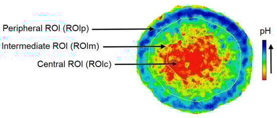 Since tumor spheroids represent heterogeneous 3D structures in terms of pH in which the cells of the outer proliferative layer have a more alkaline pH than the quiescent cells inside [69], pH measurements were performed separately for the inner and outer layers of the spheroids. The pH maps presented in Figure 5 were used to produce a spheroid outline. This contour was used to generate three concentric, non-overlapping layered regions of interest (ROIs) with a width equal to one-third of the spheroid radius (Figure 7). ROI, ROI, and ROI are defined as the center, intermediate, and peripheral ROI, respectively. Therefore, a mean pH value is associated with each zone. Radial pH data are summarized in Figure 8.