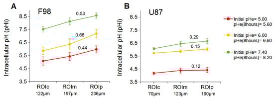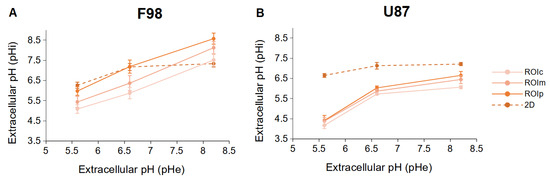 Beforehand, the basal pH of each cell line was measured in its physiological culture medium at pH = 7.4. Under this initial basal condition, pH was 7.65 ± 0.13 for F98 cells and 7.48 ± 0.12 for U87 cells.