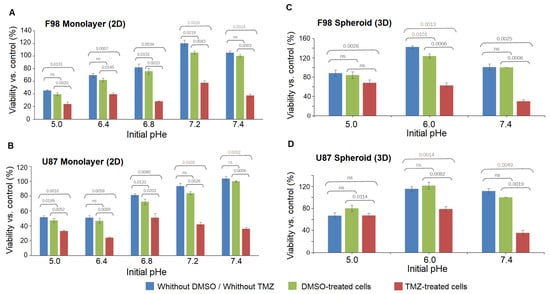 Viability after temozolomide (TMZ) treatment under different values was evaluated using an MTT test. The cells were seeded on day 1 in a 96-well plate at a rate of 1 × 10 cells per well in 200 L of culture medium. On day 3, the cells were incubated for 48 h with TMZ with different extracellular pH values for a final volume of 100 L per well. At the end of the incubation period, 10 L of an MTT solution was added to achieve a final concentration of 0.5 mg/mL. The cells were then incubated for 3 h at 37 °C under 5% CO and protected from light. The formazan crystals that formed after incubation were dissolved by adding 100 L of dimethyl sulfoxide to each well. Finally, the amount of live cells was quantified by an absorbance reading at 570 nm. The viability is expressed as a percentage of living cells relative to the control.