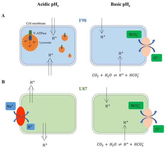 The H ions entering the cells are sequestered by the bicarbonate ions (HCO), increasing the pH. However, this is not the case with F98 cells. As F98 cells have reduced their pH, it can be assumed that they use the Cl/HCO exchanger to export the HCO ions outside the cells. Once the HCO ions are exported, H ions are no longer sequestered, leading to a decrease in pH. The Cl/HCO exchanger has been identified as an essential regulator particularly activated following alkaline incubation [52,53,54]. Activation of the Cl/HCO exchanger decreases the rate of acidification during recovery of pH from extracellular alkaline incubation.